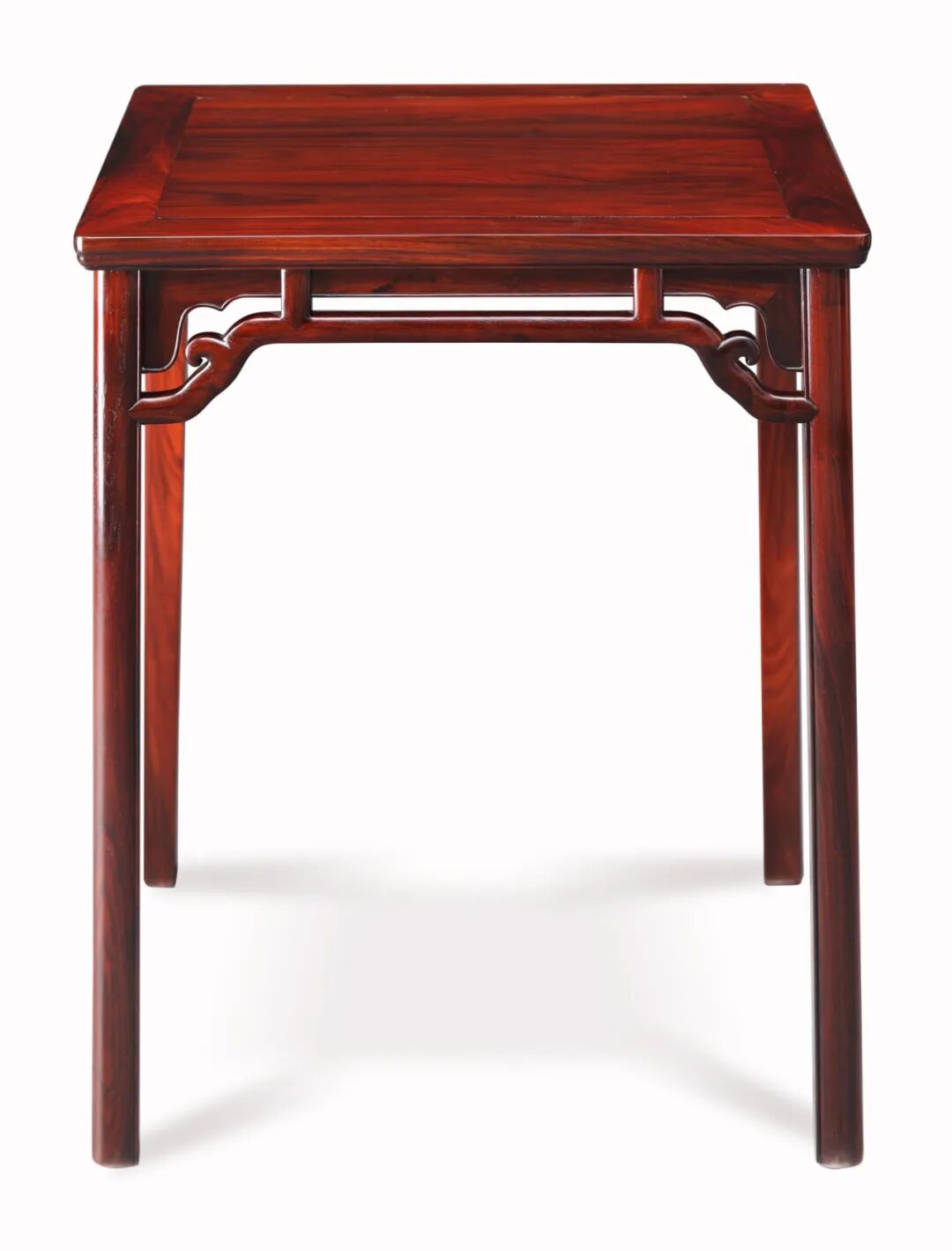 此类桌比例优美,桌面攒框镶独板,底部有两根穿带支承。边抹上舒下敛,至底压一道边线。腿足外圆内方,四面安罗锅枨,其下空间清澈通透,视觉效果极灵动轻秀。