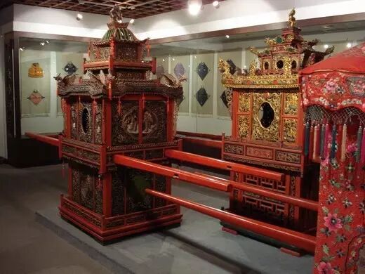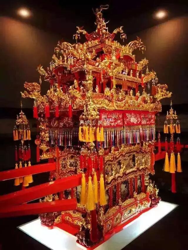 所以,不难理解为什么旧时浙东地区嫁女会有“十里红妆,良田千亩”了。而作为十里红妆队伍中最引人注目的一件“家具”,就是花轿了——因花费上万个工时制作而成所以也叫“万工轿”。