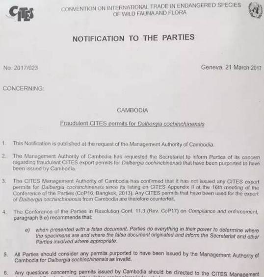 ·2017年,濒危野生动植物种国际贸易公约(CITES)组织宣布:自2013年第16届缔约方大会以来源自柬埔寨王国的交趾黄檀CITES许可证均为伪造。