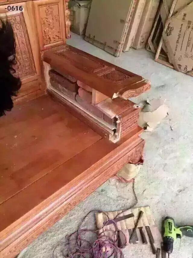 2 偷工减料的红木家具肯定便宜。大家都知道一套红木家具用料的大小有这天差地别的效果。比如原来用4公分的料偷掉用2公分,成本自然就能省很多。红木家具原本该用榫卯的现在用螺丝接口或者用枪钉,做工自然就很便宜。