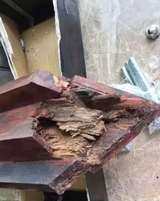 还有一些木材表面上看来跟别的材料没什么两样,其实里面却是这样的(如下图),这样的木材做成的成品家具从外表一般看不出破绽,在破坏之后它的“黑心”显露无疑!
