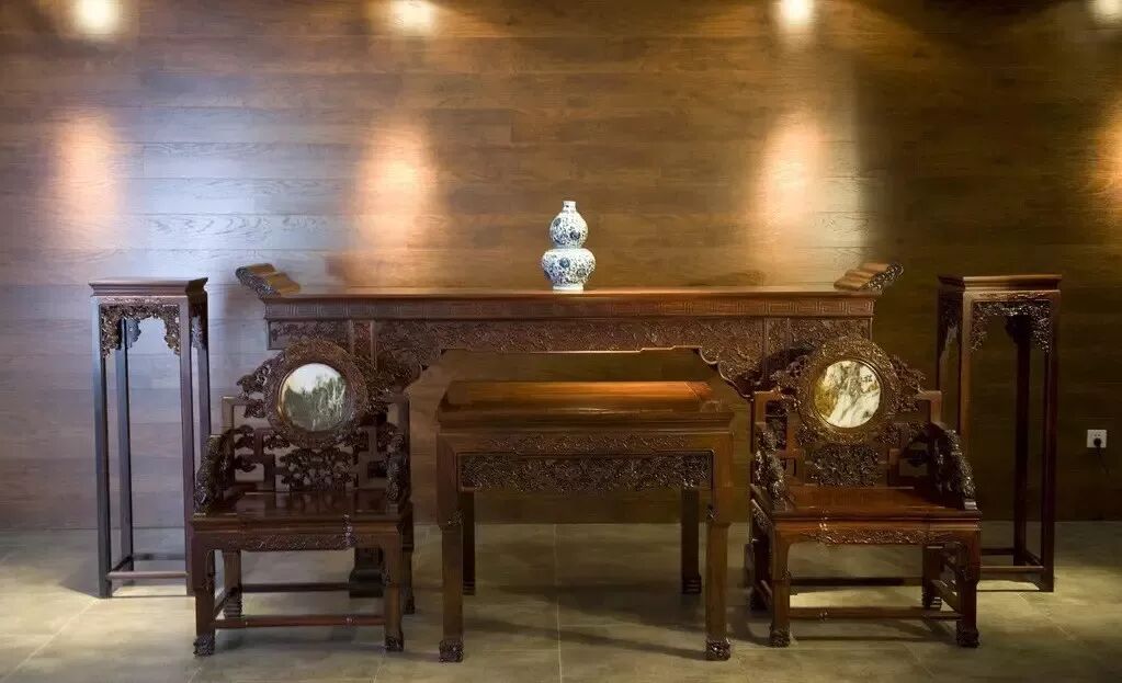 中堂家具,一般由四仙桌或八仙桌、扶手椅或太师椅成对,再加上长条案和花架等组合而来的家具,在传统的家具中,这也是仅有的一套组合式的家具。在一些影视剧中,我们可以看到一些厅堂的正中央,通常就会摆放着一套中堂家具,中堂家具是所有的传统家具中最为独特的,并且作为会客厅中最为重要的一套家具,它体现了中式传统的礼仪。