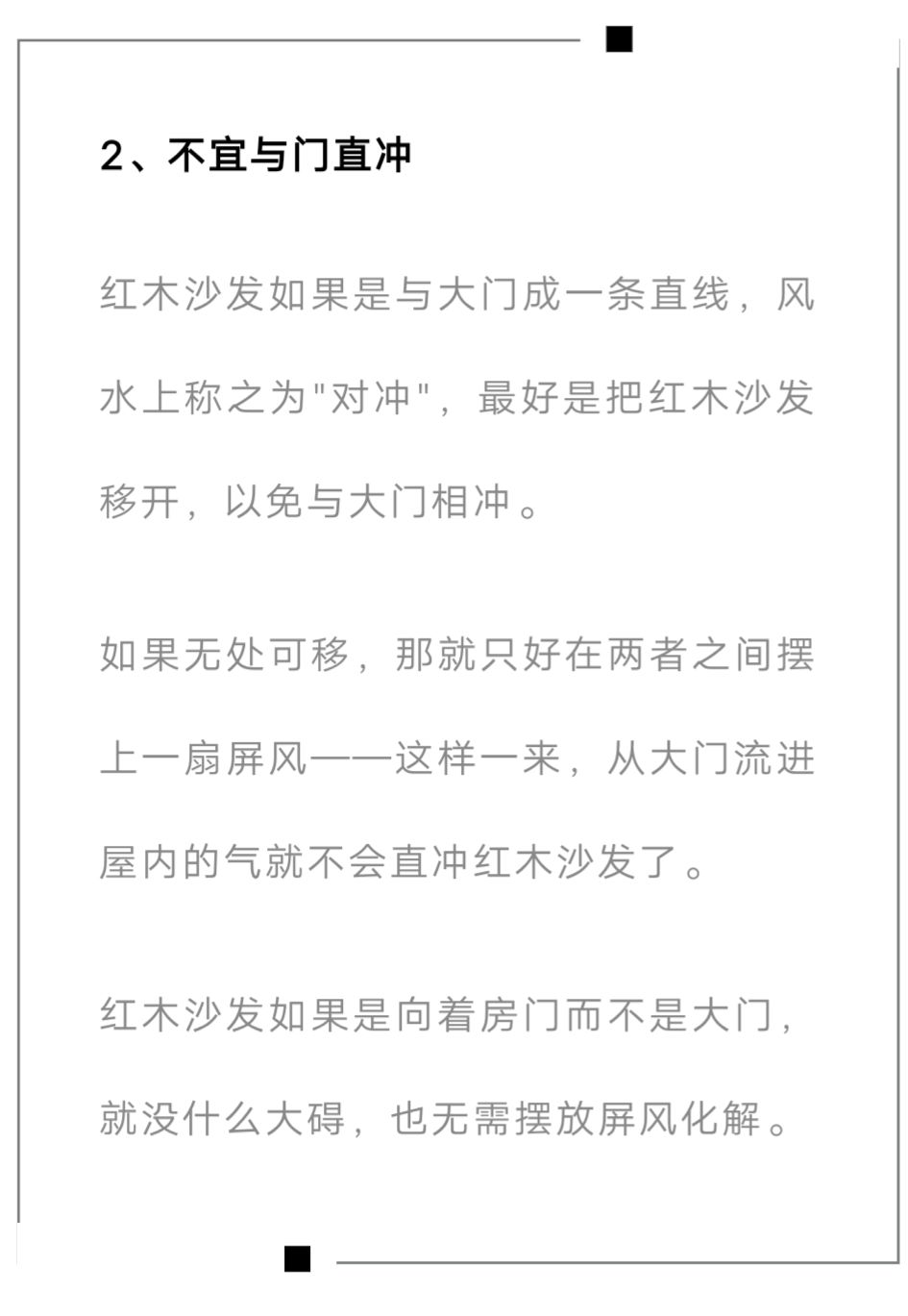 具体到我们家里就是:不管是床、沙发、书桌、柜子等等,摆放的红木家具后面一定不能是路、是水、是虚的——这样表示没有靠山,这样“家具无靠,人也无靠”,容易让人靠山山倒,靠水水流,六亲无靠,没有根基。