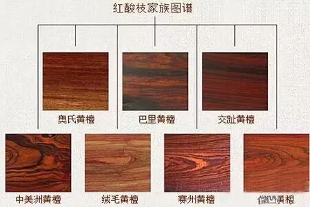 在标准中,属于红酸枝木类的有七种,学名分别为交趾黄檀(老挝酸枝)、巴里黄檀、赛川黄檀、绒毛黄檀、奥氏黄檀(缅甸酸枝)、中美洲黄檀和微凹黄檀。其中以交趾黄檀(拉丁名:cochinchinensis),也就是老挝大红酸枝最为出名。