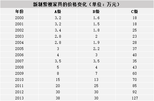 从2011年开始紫檀价格已开始呈分裂式增长,即质优者增长幅度大于质次者,如按紫檀原木的重量分为三级,即A级: 48公斤以上,B级: 30公斤以上,C级: 30公斤以下,价格变化情况如下:
