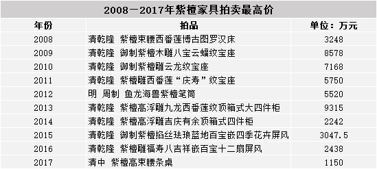 2008—2017年紫檀家具拍卖最高价