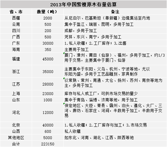 紫檀的原材料主要是指已除掉树皮、边材之原木,锯材极少。目前估算紫檀原木存量,只有根据相关紫檀贸易公司提供的数据作粗略统计。
