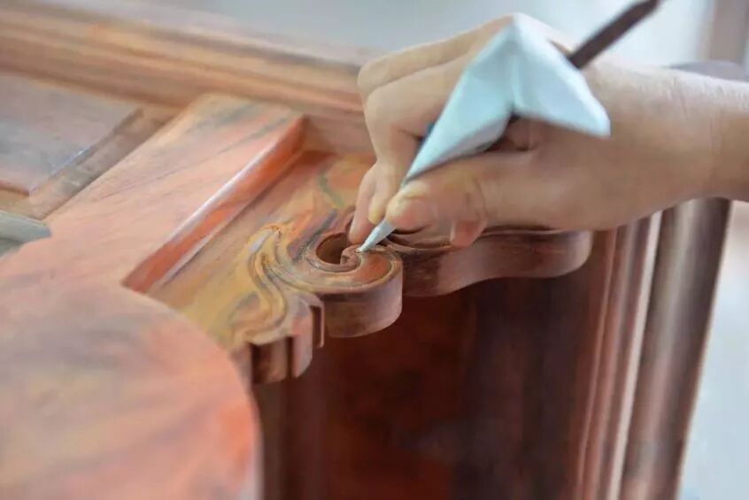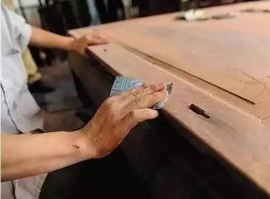 要使传统家具的表面光滑,在打磨过程中至少要经过从粗到细12道打磨工序,每道工序磨工必须将上道留下的痕迹彻底打磨干净,再使用最精细的工具将家具表面打磨得平滑无比。