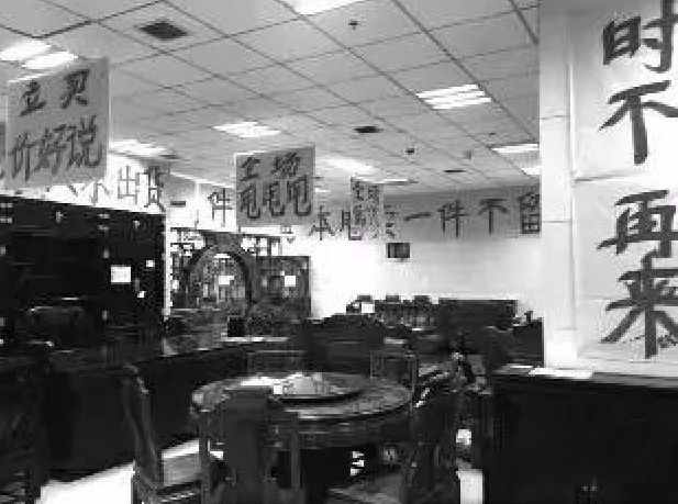 市场旁有家红木店,门口扩音器里的促销声声不绝,仿佛在卖力地融入这快过年的气氛。而店内外铺天盖地张贴着“亏本甩卖”、“立买价好说”、“不计成本”、“血本无归”等黄纸标语,显得格外醒目。然而当顾客走进去,三个小伙并不主动介绍,顾客询价时他们还玩着手机。