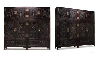 2013年,一套“清乾隆紫檀高浮雕九龙西番莲纹顶箱式大四件柜”以2800万元起拍,经过场内外藏家数十轮鏖战,最终以人民币9315万元成交,刷新了中国古董家具最高成交纪录!