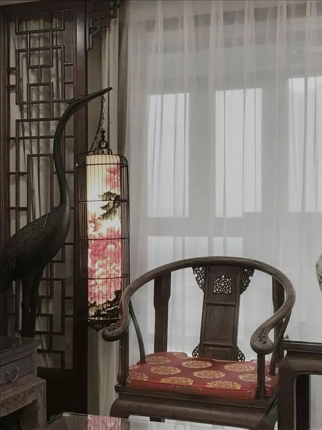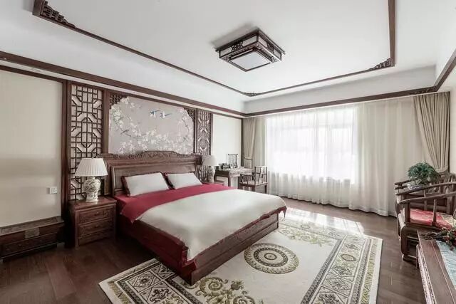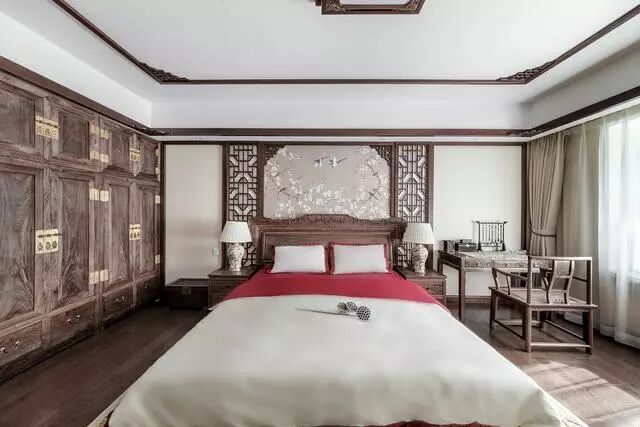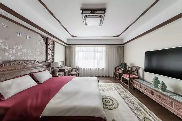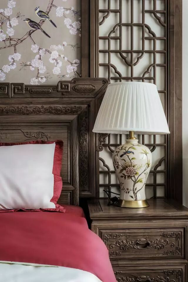古朴的家具,精美的雕花,带有古香古的花鸟墙画,个性的台灯,种种元素叠加创造了这古色古香的魅力。