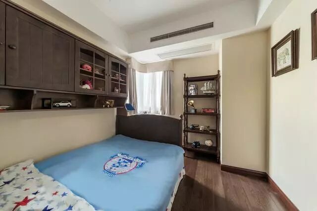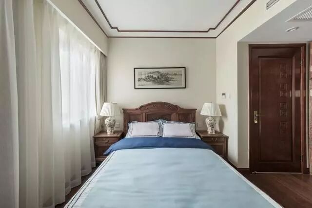 父母房的设计,清新雅致风,迎来一席传统之韵,一幅山水挂画,简单有意境,淡色窗帘和蓝色床品,打消了传统风格的沉重之感。