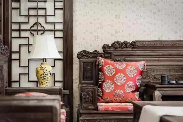 恰到好处的明清红木家具,搭配中国红软装,让整个空间耳目一新,既有红木家具的庄重端美,亦有艳丽舒适的视觉享受。
