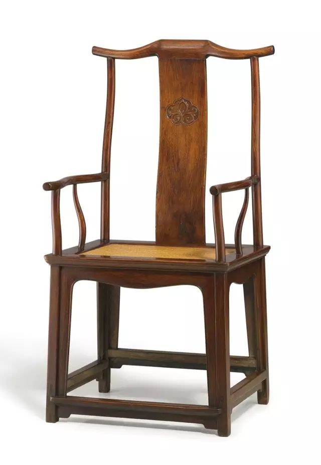 官帽椅是扶手椅中的典型代表,椅身由靠背、扶手、座面、椅腿四部分构成,无束腰。因靠背上部的枕木(又叫“搭脑”或“搭脑梁”)中间高出,左右两端微微起翘,形如古代官帽而得名。