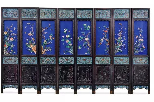 清乾隆 御制紫檀掐丝珐琅蓝地百宝嵌四季花卉屏风