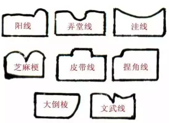 古典家具上常用的线脚有多种,常见的有皮带线、碗口线、鳝鱼肚、鲫鱼背、芝麻梗、竹片浑、阳线、阴线、文武线、捏角线、洼线、凹线、瓜棱线、剑棱线、方线等共有几十种,但形状都是介于方(含长方)和圆(含椭圆)之间的变形。