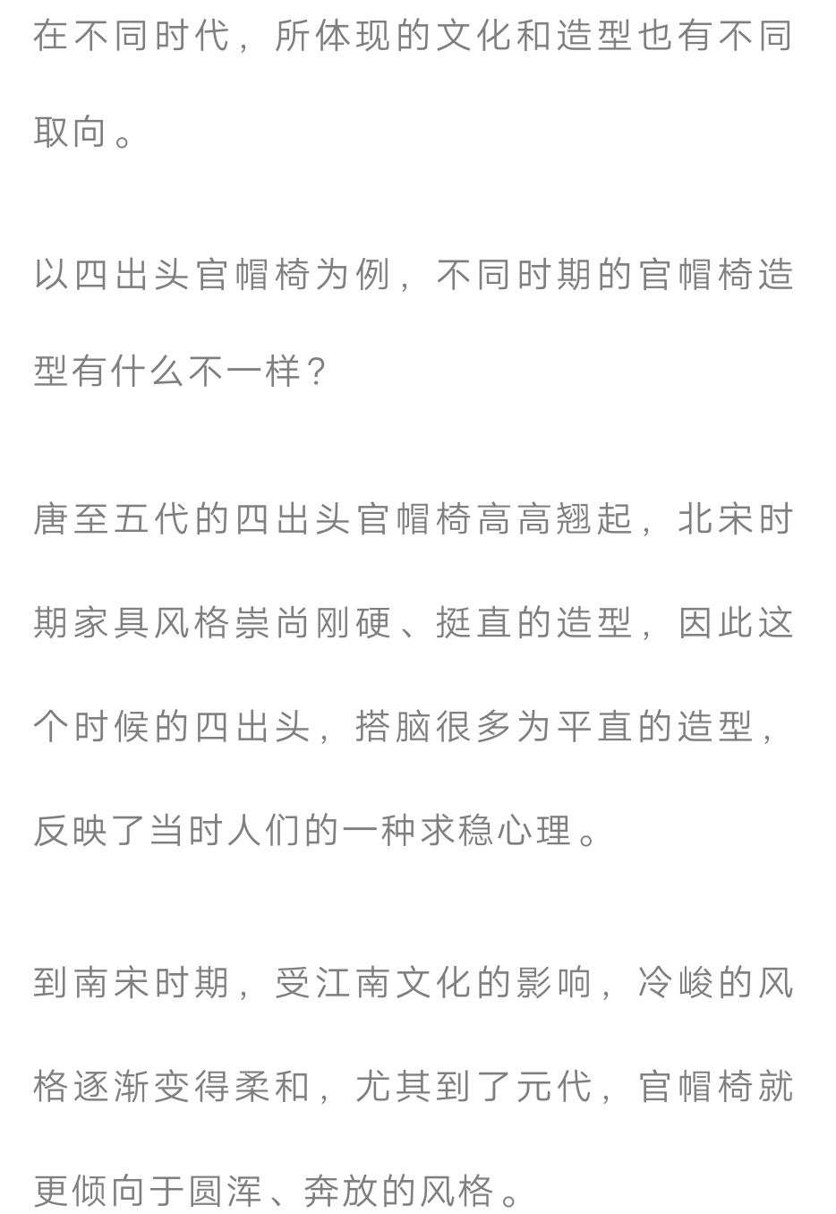 唐宋大部分椅具都为四出头,在搭脑和扶手处横竖材交接的部位,开榫部分以外,如果齐头,榫卯会不坚固,留出头,就不容易劈裂,这也就形成了四出头官帽椅最初的形态。