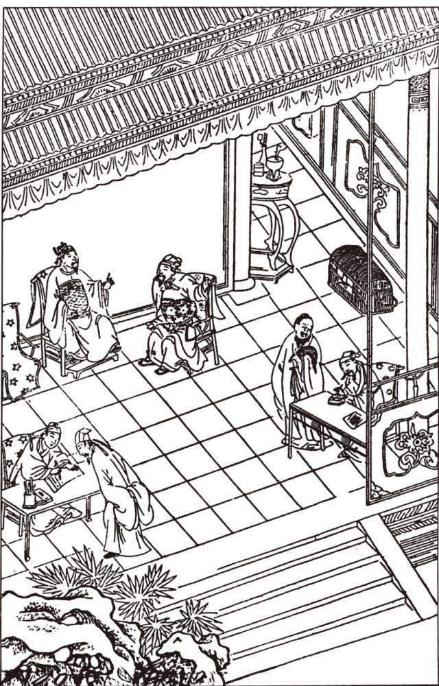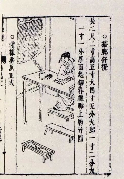 明代杨定见本《忠义水浒全传》其厅堂正中桌下放滚凳一具,桌两侧各放一把圈椅。《鲁班经匠家镜》图式中也有一具位在图的正中,不和坐具及桌案连属。