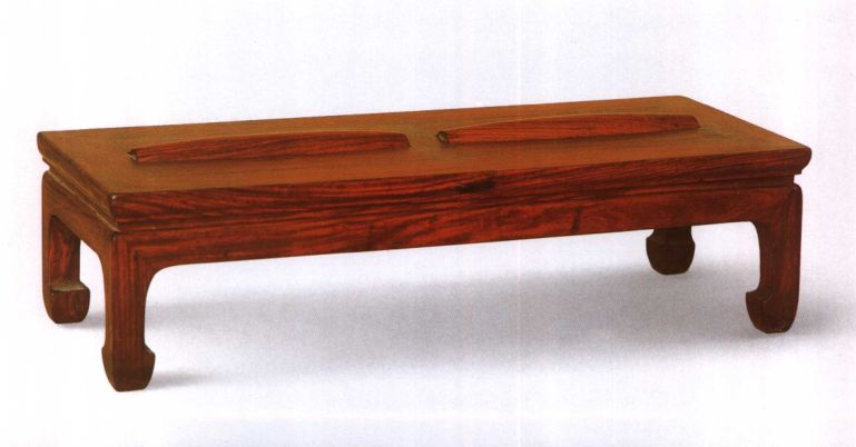 此凳有束腰,内翻马蹄,似炕桌而矮小。面板被中枨分隔为两块,各留长条空当,安中间粗两端细的活轴两根,和《鲁班经匠家镜》图式十分相似。