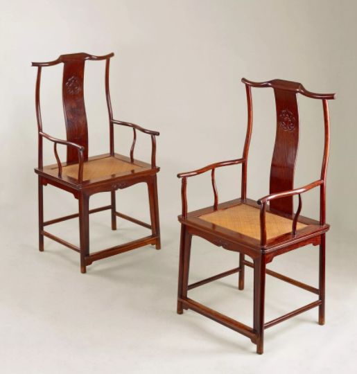 官帽椅是典型的明式家具代表,以其高大、简约、线条流畅而著称,其椅背侧看是S形,通常采用边框镶板的工艺,在中间分出几个格子,也有的是镂空雕刻出如意、云头等纹样,或者是以浮雕的形式雕刻一些简单的图样,显得美观而且大方。