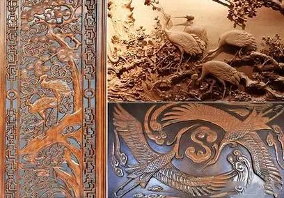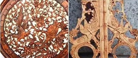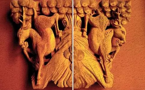 木雕中喜鹊是吉祥瑞鸟,广泛应用于家具,什器等,如两只喜鹊相对表示“喜相逢”或“双喜”,喜鹊踏梅梢,表示“喜上眉梢”,喜鹊与桂圆表示“喜报三元”。