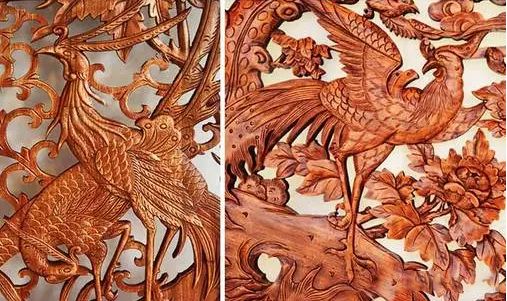 凤鸟的形态特征主要有鸡嘴、鸳鸯头、火鸡冠、仙鹤身、孔雀翎、鹭鹭腿,是组合性的瑞鸟图纹,多用 于漆器家具上。