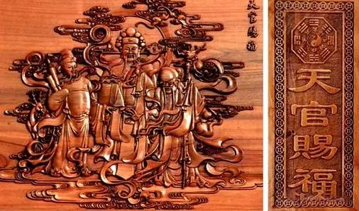 天官为三官之尊,执掌福,民间以福星相称,常与禄星、寿星并列。组成“天官赐福”、“受天榀禄”、“指日高升”、“加官进爵”等图案纹饰。