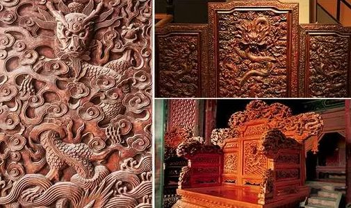 大臣官员可雕三爪和四爪,称为民俗的吉祥图。龙图案常用于 屏风、床榻、椅子、竖柜、几架、桌案的雕饰工艺中。