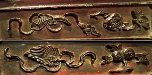 古人认为八件宝物,其数多于八,其物诸如珠宝、古钱,玉罄、样云,犀角、红珊瑚、艾叶、蕉叶、铜鼎、灵芝,银锭、如意,方胜,任取其中八种即为“八宝”,这些图纹多应用古家具雕刻、什器漆饰等方面。