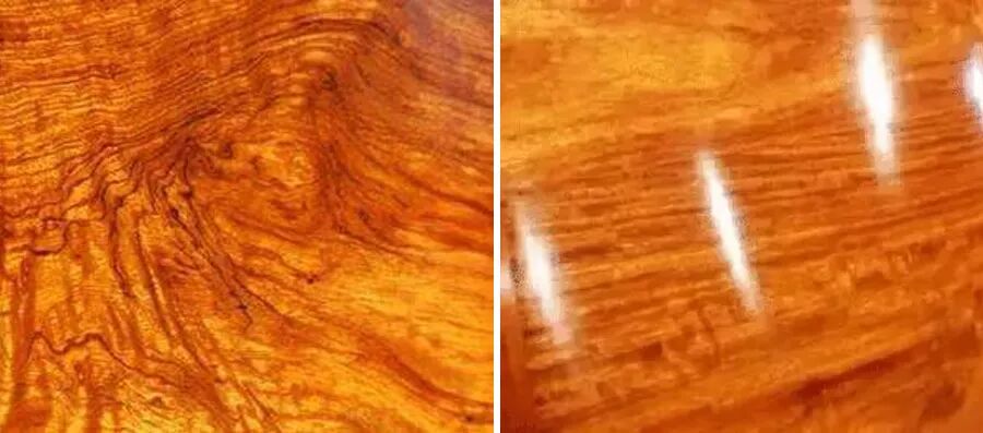缅甸花梨中有一层淡淡的荧光,从木材的切面借着斜射来的光线看,就能发现,而非洲花梨没有。