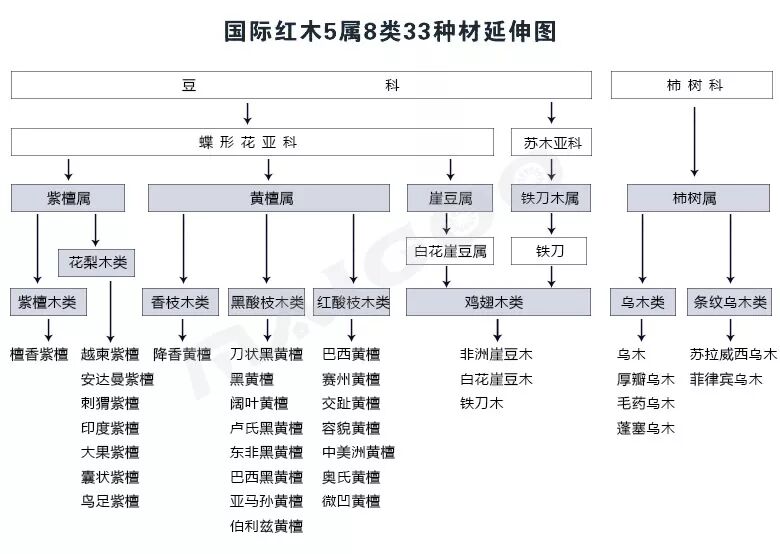 现将5属8类33种红木拉丁名、商品名、俗称、产地、构造特征、必备条件及图鉴予以整理,供参考: