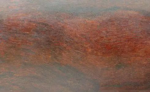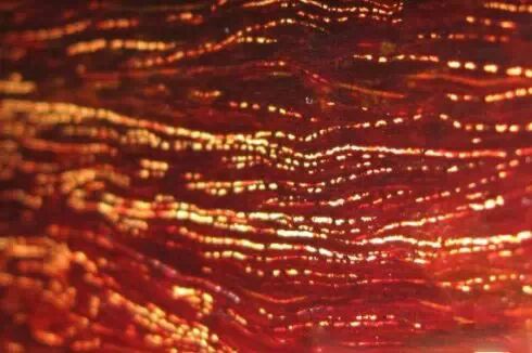 ▲鸡翅木——肌理致密,紫褐色深浅相间成纹,此纵切而微斜的剖面,纤细浮动,予人羽毛璀璨闪耀的感觉。