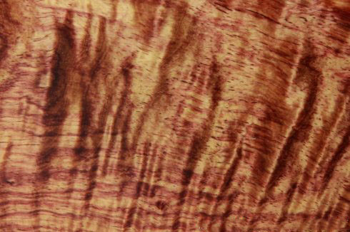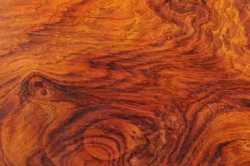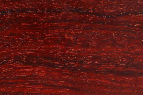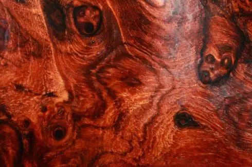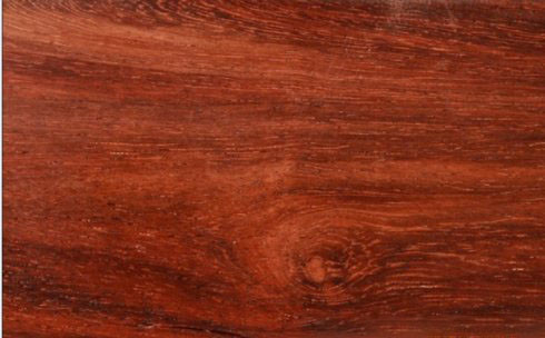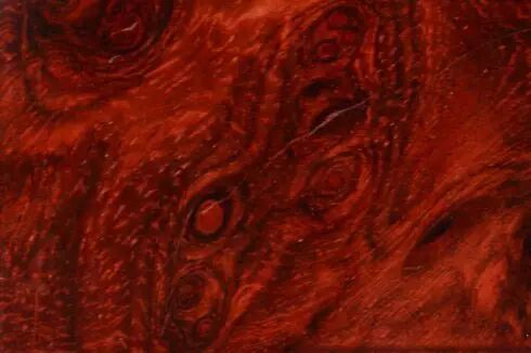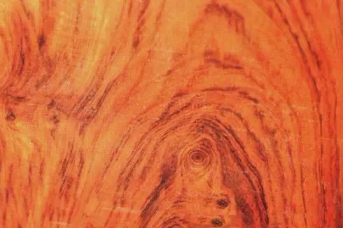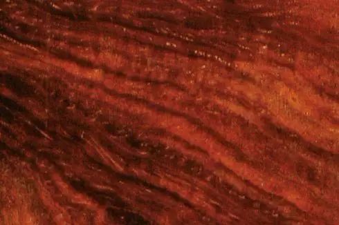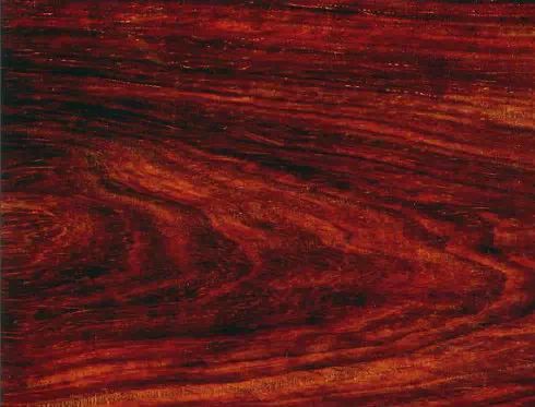 ▲红花梨——心材颜色变化大,新切面血红色,久呈紫褐色,非洲所产亚花梨木材中材质最好、纹理最美的。