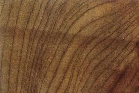 ▲香樟木——我国家具制造传统用材,表面红棕至暗棕色,横断面可见年轮,耐腐、致密、有香气,防虫蛀。