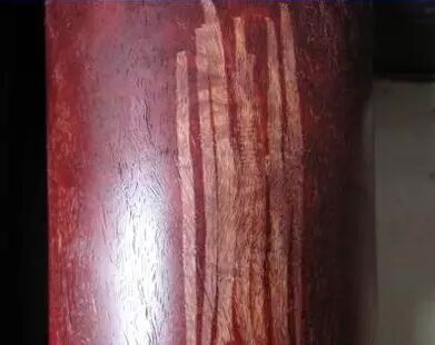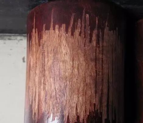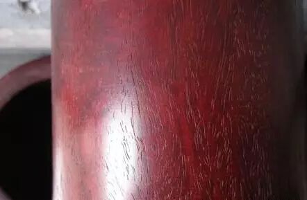 大家看后是不是觉得很不可思议!真是触目惊心啊!这个到底是什么原因呢?刮开后,我们看到就明显了,整个笔筒居然是用小叶紫檀的白皮做的,然后染色、上蜡、抛光。这样的玩意,说实话行家也会上当啊。