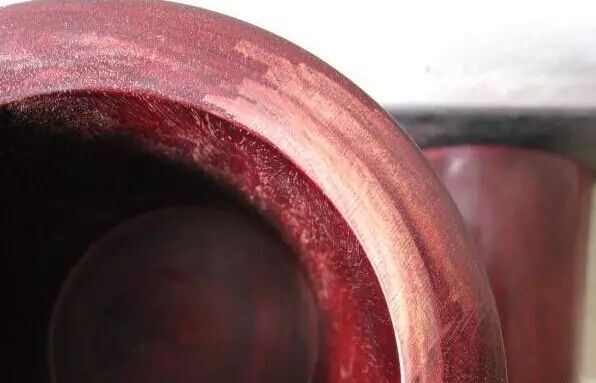 这种破坏性的验货方式虽然有效,但很多时候都不合适采用的。对付这种造假方式,无损验货方式就是一个字:只能“擦”。因为这种作假手段的核心就是染色,虽然表面上蜡,可以暂时起到固色的作用,但只要用纸巾用力多擦几次,就会发现掉色严重的现象(真正的紫檀只会有少量的掉色),而且被擦的地方颜色会越擦越浅,这个就很不正常了。