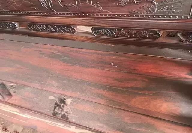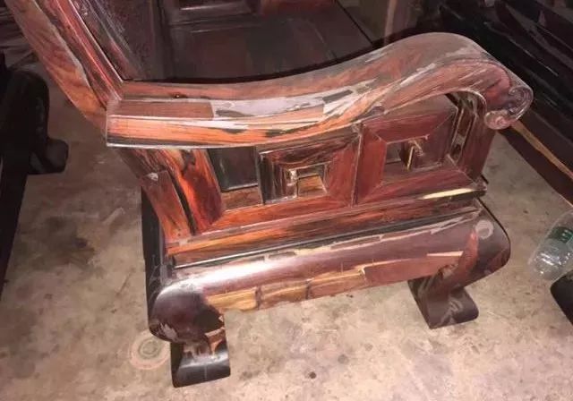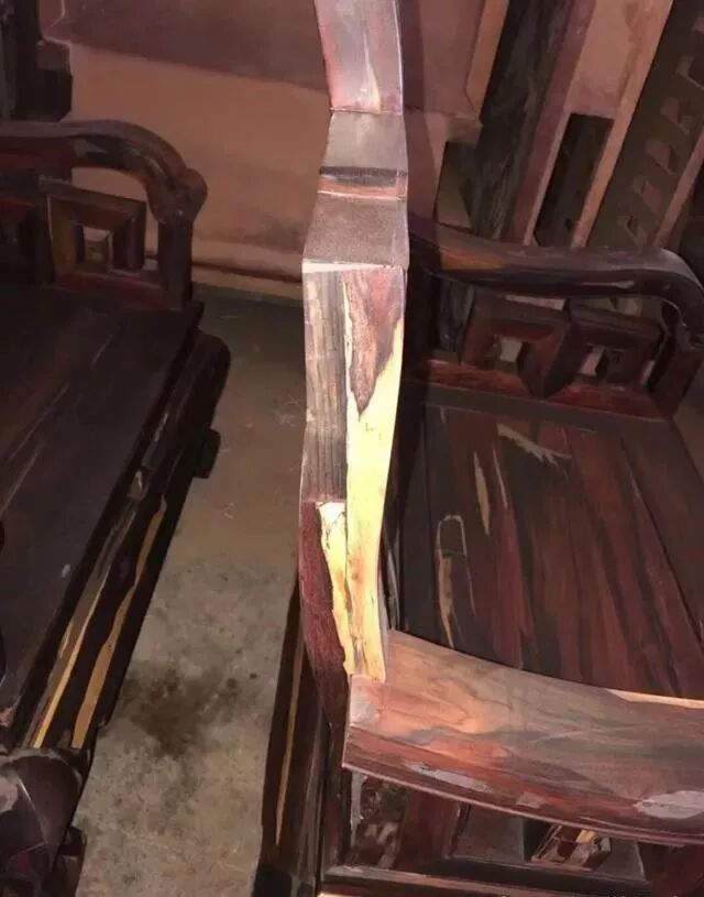 当时红木商人也没有仔细看出来,以为黑色是大红酸枝老料的,到了工厂,在木工的刮刀之下,颜色全部被刮没了,沙发也就原形毕露,整套沙发就没有一块好料,全部是小料拼接起来的。