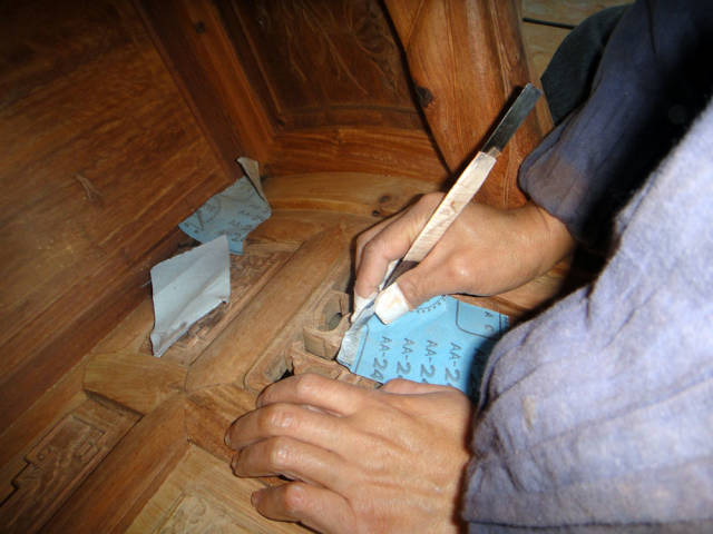 1、第一次主要是把雕刻的小部件打磨处理完毕。打磨时把砂纸卷成圆锥状,这样可以将板材的各个部位都能打磨到位,打磨的时候要用180号、240号、320号、600号、1500号不同的5种砂纸分别依次打磨多遍,目的是为了把家具表面打磨光滑,使用越来越细的砂纸打磨是为了把较粗砂纸痕迹磨掉。