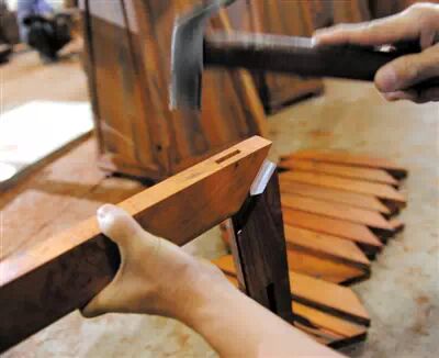 刨平后的精料就可以进行开榫凿眼。红木家具的各部件就是用榫卯结构连结的。榫卯结构是榫和卯的结合,是木件之间多与少、高与低、长与短之间的巧妙组合,可有效地限制木件向各个方向的扭动,不会造成木材撑裂,较好地保证了家具的整体性,也大大提升了红木家具的内在品质。
