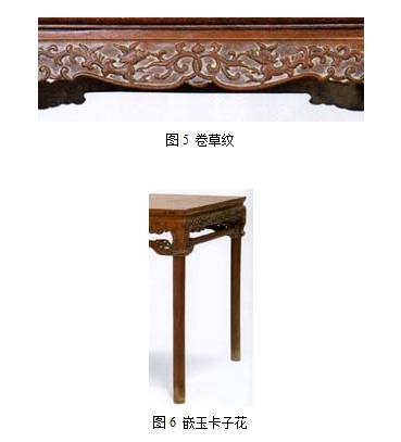 在家具上用嵌也比较广泛,有不少家具在坐椅的背板上,桌案的横枨上,嵌以小块玉石和不同色调的木饰,造成木材的色调与纹理的不同效果,也很新巧参见图1-图4