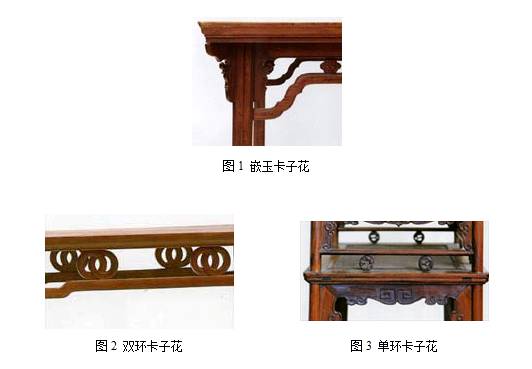 就是卡在两条横枨之间的花饰。多数是用木材镂雕的纹样。也有用其它材料,如嵌玉卡子花等。卡子花常用的有双环卡子花、单环卡子花、枫叶卡子花等等。
