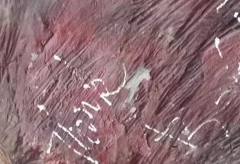 因为觉得不对,于是,尝试着用一个石子在其中一根的头上用力划了一下,红色的树心居然掉了颜色,露出了灰白的水泥: