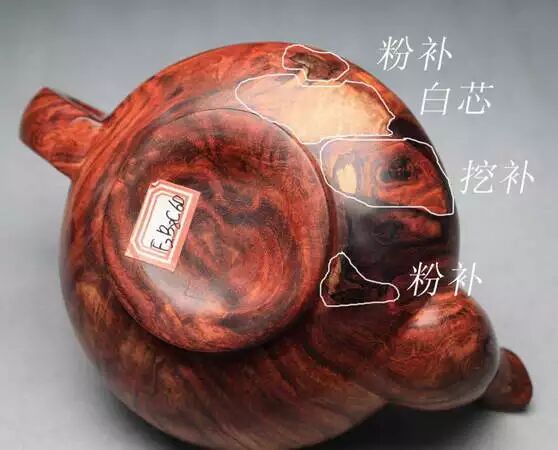 树头封胶脱落的那一块应该也是如假包换大红酸枝,但它只是一个木头塞子: