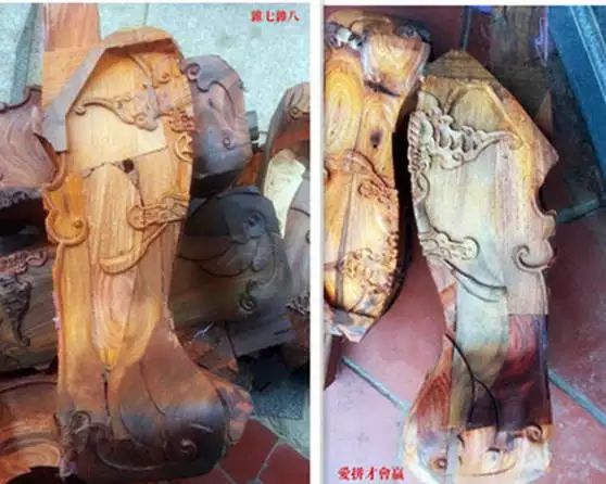 用水泥把空心灌满,划上几道砍伐时的“锯痕”,涂上底色。不仅让木头的品级上升到实心料,还顺带着把水泥也卖出了大红酸枝的价格!