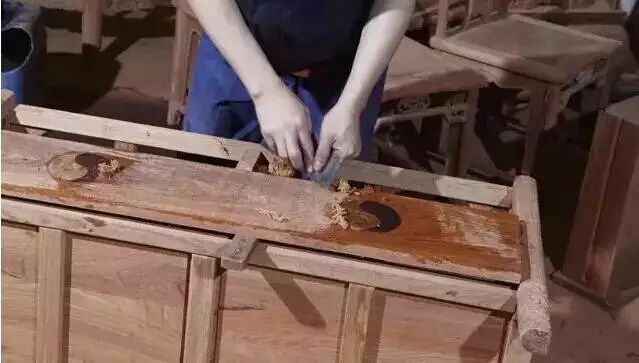 雕刻成型,木料损失18%。家具组装好,上大漆之前,要进行刮磨,使用十多种刮磨工具进行刮磨,才能使家具平整。刮磨完成后,还需要用目数不同的砂纸进行磨砂,才能使家具质感细腻。这其中,又耗费不少木料。