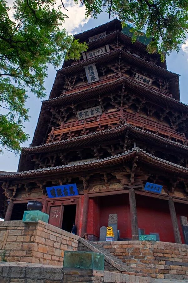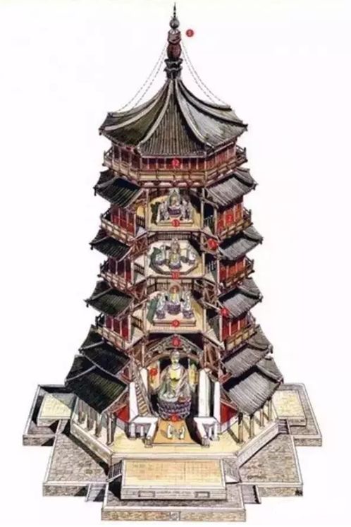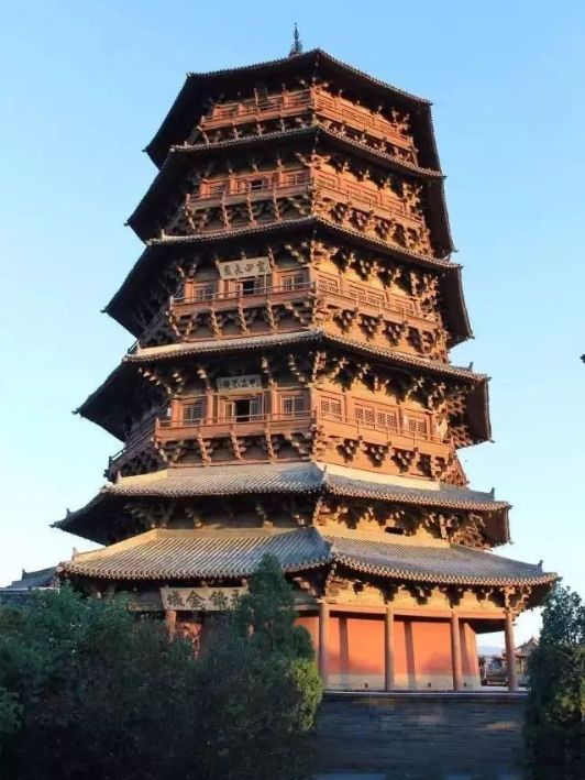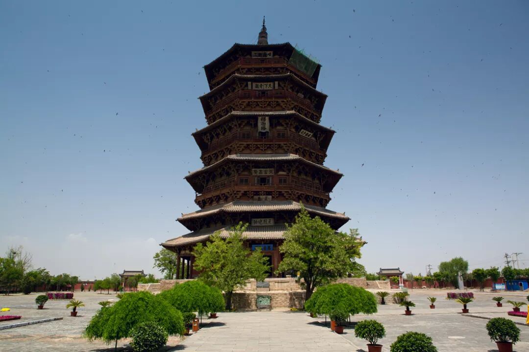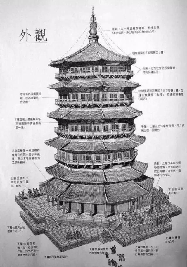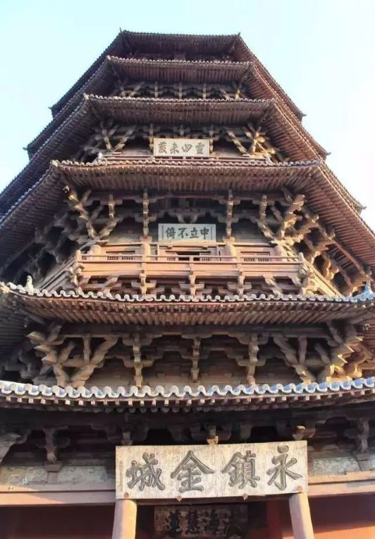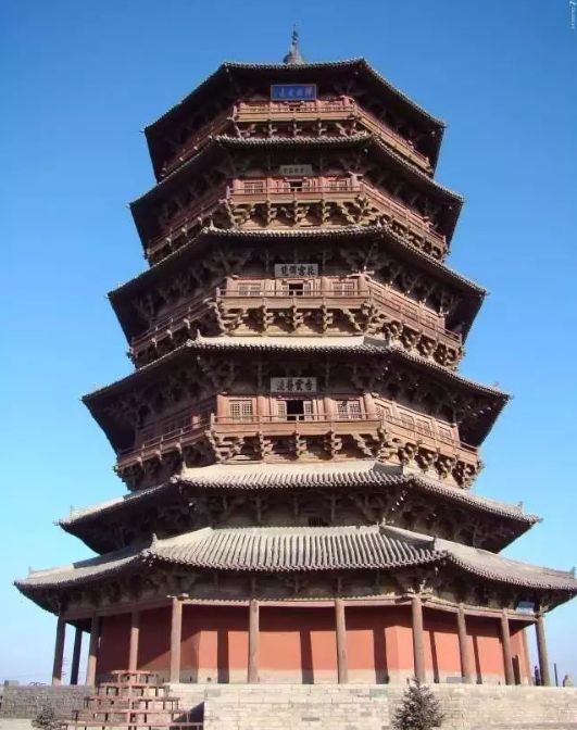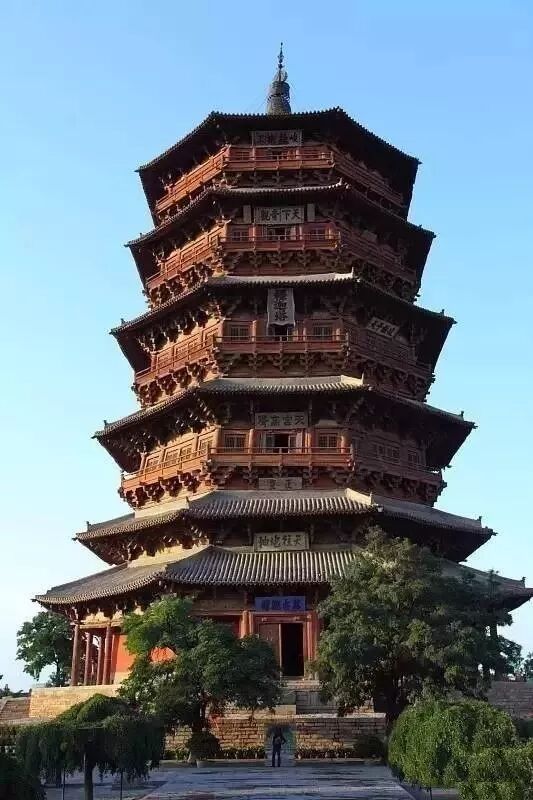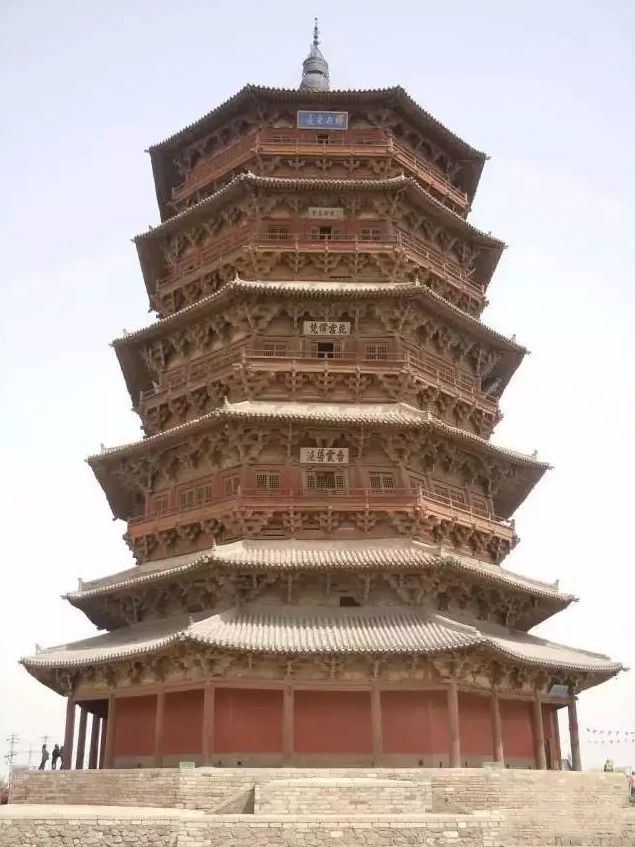木塔,顾名思义,木塔全部用木建成的,建在4米高的两层石砌台基上,塔高67.31米,相当于今天二三十层楼的高度,底层直径30.27米,呈平面八角形,第一层立面重檐,以上各层均为单檐,共五层六檐,而每层内平座形成暗层,实际上共9层。