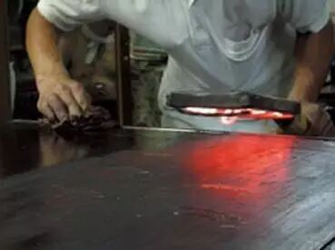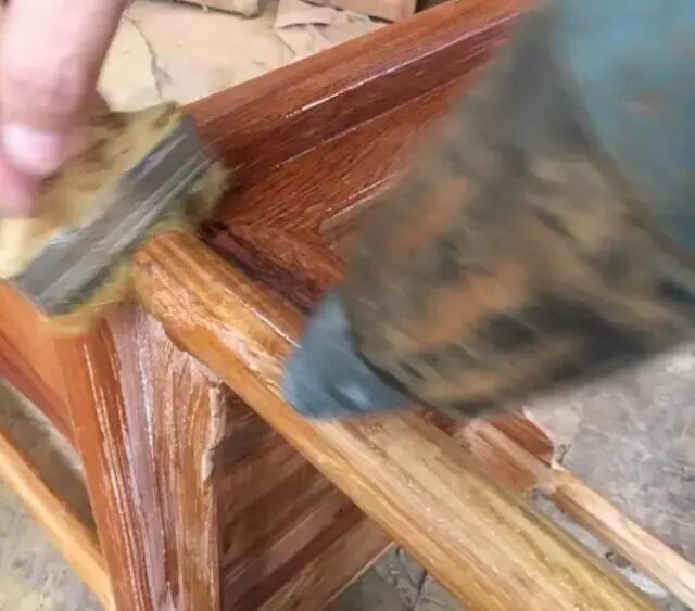 一般在烫完蜡之后还有一个起蜡的工序,即用蜡起子将残存在家具表面的浮蜡铲净,直至用手摸上去感觉不发黏为佳。起蜡要仔细认真,特别是有雕刻的地方,不能留残蜡,否则会影响家具表面的光洁度。技术精湛熟练的老师傅,一次就可以将烫蜡涂到恰到好处,不用再起蜡,不仅省了蜡也省了时间。