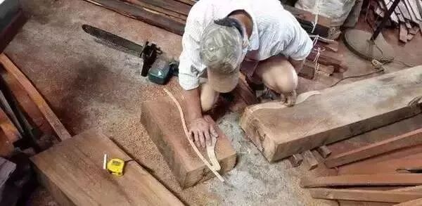 选料有两种,一种是讲究的厂家自己去原产地,挑选、购买原材料,这种花费的人力物力财力都非常大;另一种是最常见的,在当地红木原材料市场选择自己需要的原材料。通常情况下,用料环节从木头买回来,在工厂卸车的时候就开始了。