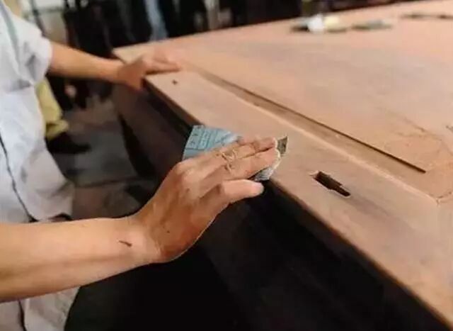 接下来才是整体打磨。家具部位的特点,用各种形制的铁片小刀粗磨,如果发现有裂痕,还要用胶水,木粉对其进行修补;接着用各种粗细不同的砂纸进行打磨,需要耐心和经验。