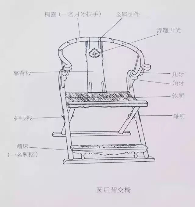 为了折叠交椅的扶手与下面的构件(鹅脖及联帮棍)相交,交椅的扶手只能是由安在后腿上端的、弯转向前探伸的构件来支撑。